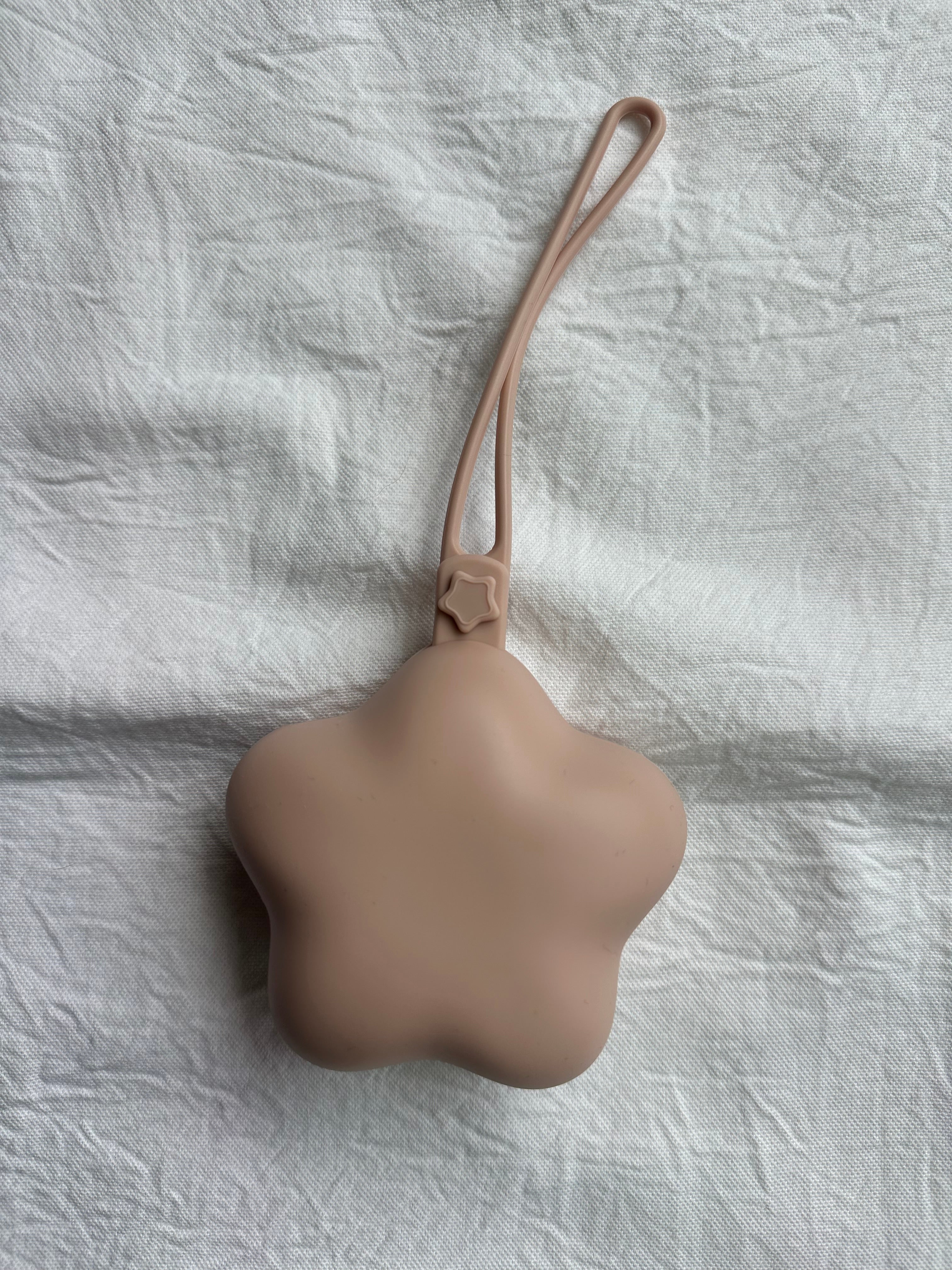 El estuche para guardar el chupón tiene un encantador diseño de estrella, que le da un toque dulce y divertido. Viene en un suave color beige, ideal para mantener el chupón limpio y protegido. Su tamaño compacto lo hace perfecto para llevarlo en la carriola o en la pañalera, asegurando que siempre esté a mano y listo para usarse.