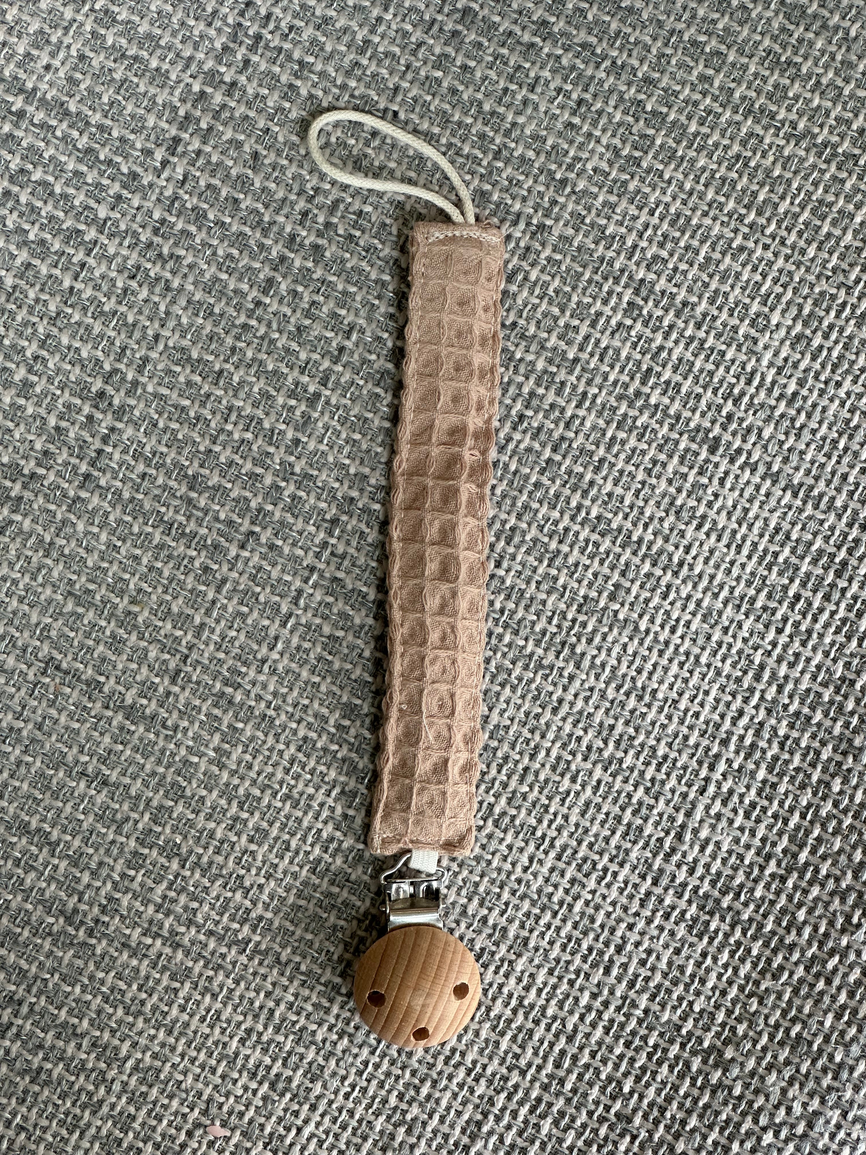El porta chupones está hecho de tela suave y resistente, ideal para mantener el chupón limpio y accesible. Viene en color rosa y su diseño es muy coqueto ya que trae un moñito.